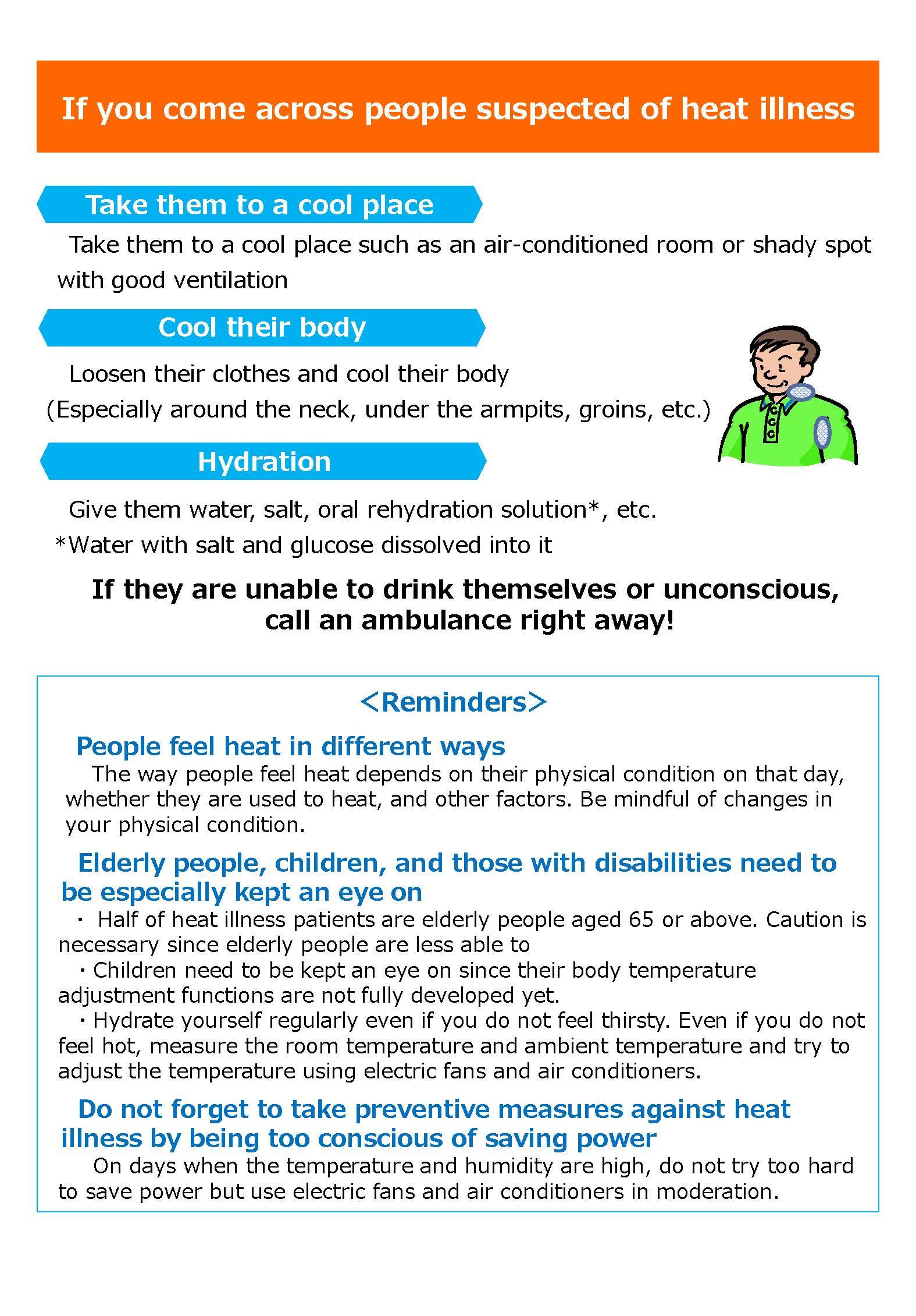 Individual body types have a great bearing on the incidence of heatstroke. Persons with cold symptoms (fever, diarrhea, stuffiness); those who have consumed large volumes of alcohol the previous day; have skipped breakfast: are lacking sleep; or have an underlying health condition (obesity, diabetes, high blood pressure, mental/nervous disorder) are particularly susceptible to heatstroke and should be especially vigilant.